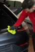 Mann in rotem Hemd reinigt den offenen Kofferraum eines mattschwarzen Autos mit einem gelben Tuch.
